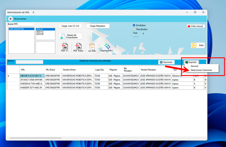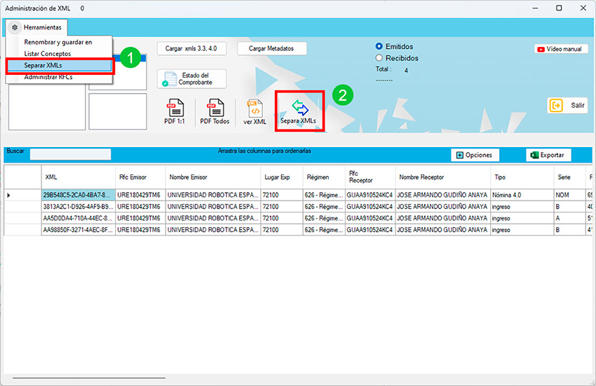 Al realizar tus descargas el programa guarda los XML separados por año y mes. Sin embargo, al activar la opción «Separa XMLs», puedes organizar aún más los documentos dentro de esa misma carpeta. Esta funcionalidad te permite identificar fácilmente si los comprobantes descargados son recibos de nómina, notas de crédito, recibos de pago, comprobantes vigentes o cancelados.