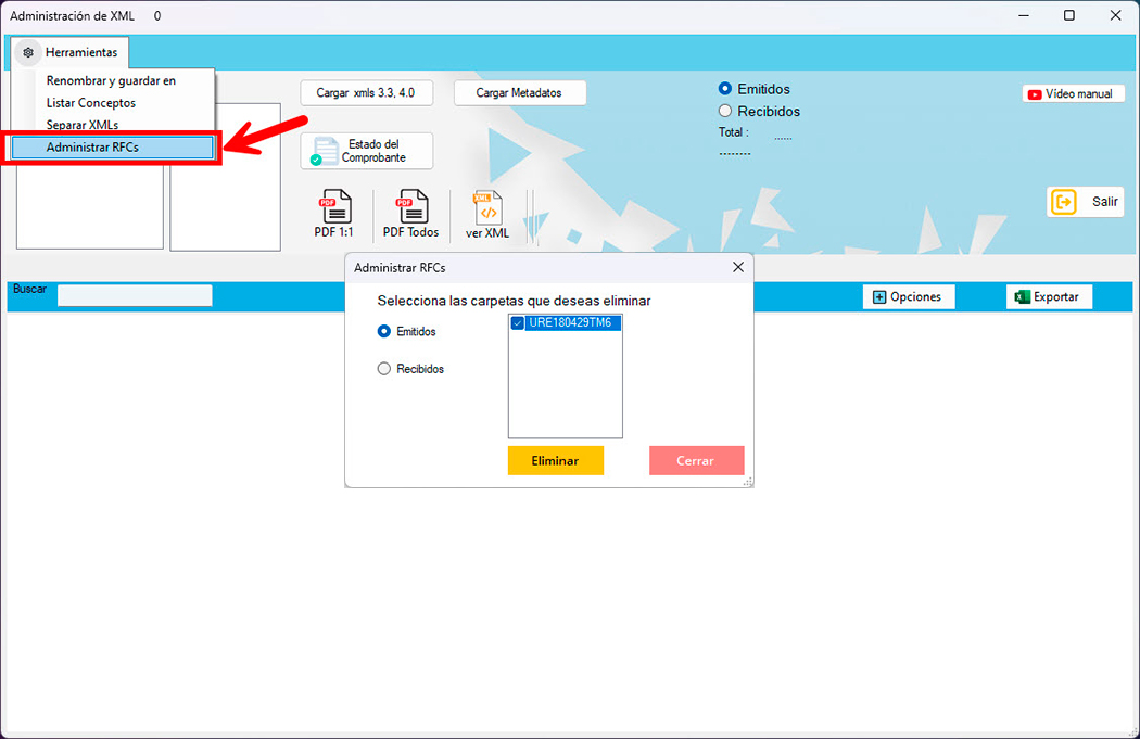 Con esta opción, puedes borrar las carpetas de los archivos de los RFCs que has descargado. Así, podrás quitar los registros que no te interesan ver en el administrador.