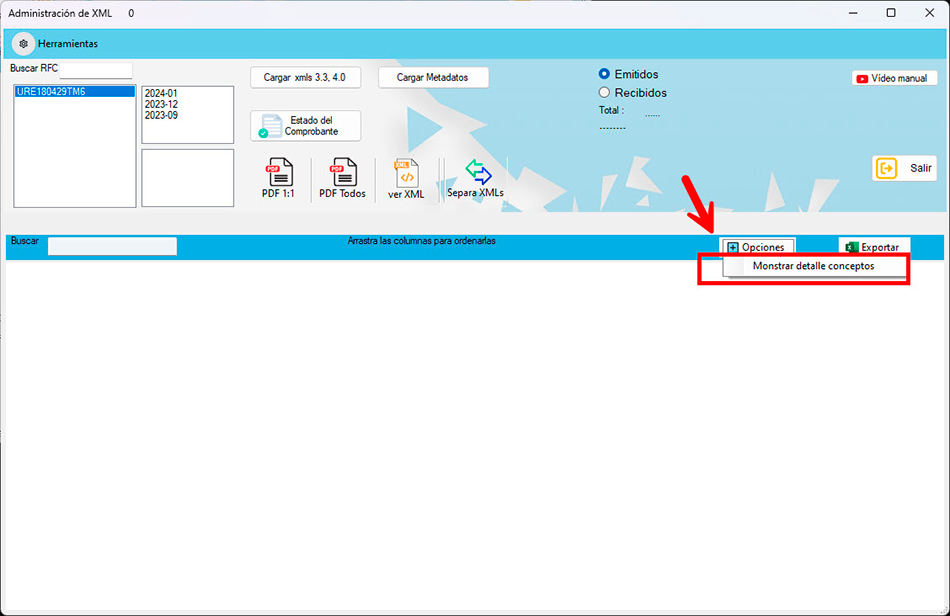 En el apartado de opciones, se encuentra la opción “Mostrar detalle conceptos”, que muestra una tabla en la parte inferior. En esta tabla, se puede ver el desglose de los conceptos, así como los impuestos trasladados, retenidos y locales.