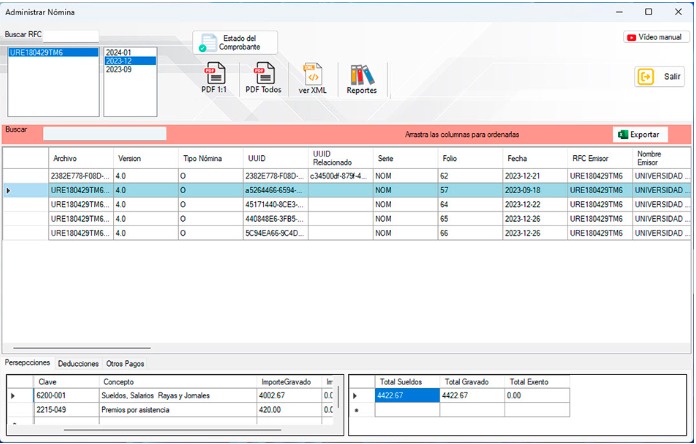Consulta las claves de cada una de las deducciones, percepciones y otros pagos, así como los totales de cada uno.
