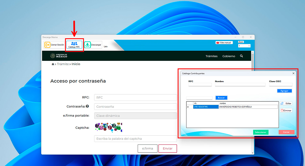 Este apartado te permite guardar y seleccionar los datos de los contribuyentes que descargas habitualmente. Solo tienes que introducir su RFC, nombre y contraseña una vez. Así, la próxima vez que quieras descargar, solo deberás escribir el captcha y accederás más rápido.